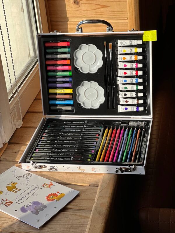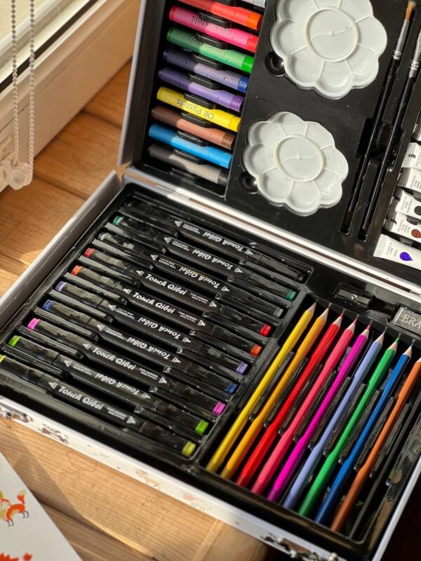 У ньому ви знайдете все необхідне для юного художника: широку палітру фломастерів на водній основі, олівців, пензлів та фарб.