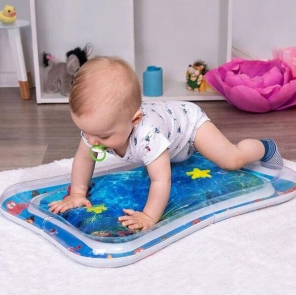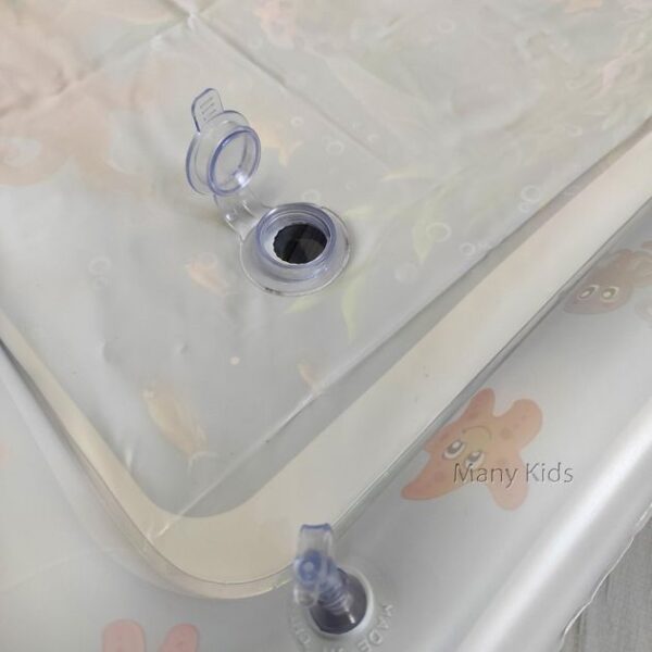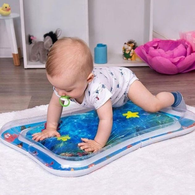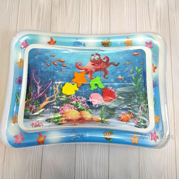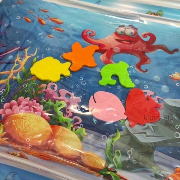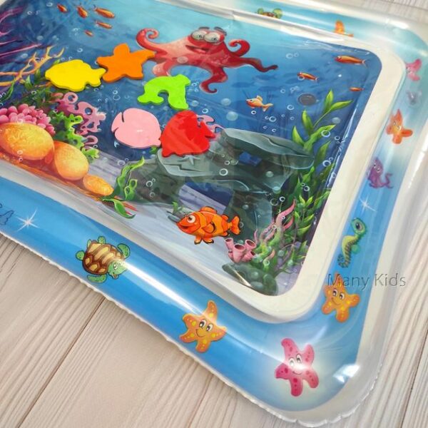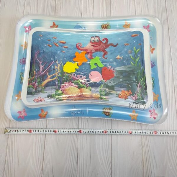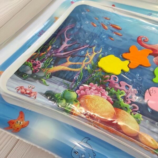 Килимок яскравий, цікавий і постійно гойдається. Також у ньому плавають різні фігурки кольорових рибок. Просто потрібно надути та заповнити його водою.