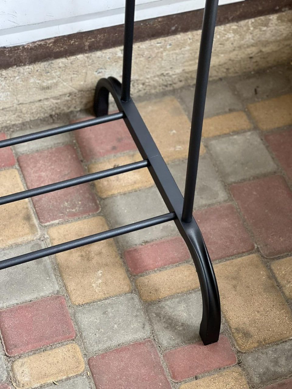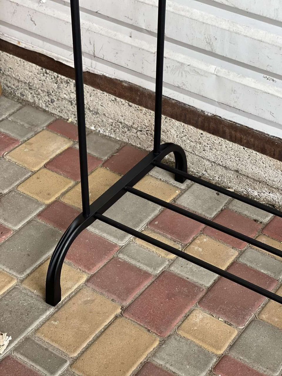 Стійка виготовлена із міцної металевої труби, оснащена нижнім ярусом, на який можна поставити коробки із взуттям, органайзери та кошики для зберігання. Вішалка-стійка ідеально підходить для передпокою, спальні або вбиральні, підсобного приміщення, пральні, сушарки, може використовуватися в офісі, а також для презентації одягу в магазинах, театрах чи студіях.