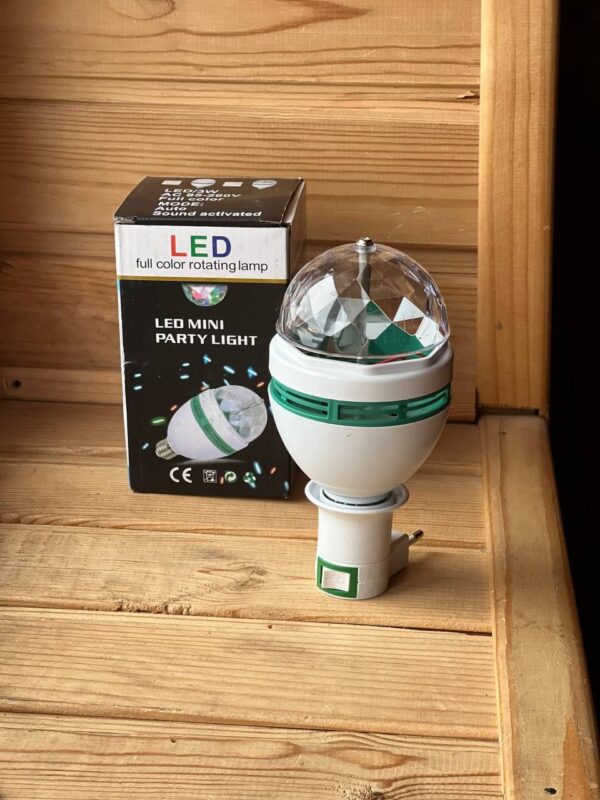 Усередині лампи розміщені червоні, зелені та сині світлодіоди. Зверху вони закриті прозорою пластиковою колбою з безліччю граней. Це дозволяє отримати м’яке розсіяне світло, яке проектується на стіни і стелю, створюючи ефект дискотеки. за допомогою невеликого двигуна. Світлодіодна лампа для вечірок розроблена зі стандартним патроном, що дозволяє використовувати її як звичайну лампочку.