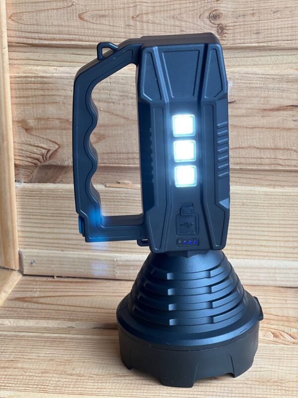 Легкий міцний ліхтарик із верхньою ручкою. Рівень заряду акумулятора індикує 4 сині світлодіоди. За допомогою перемикача можна вибрати 3 типи освітлення (класичне переднє світло, попереджувальне миготливе або бічне ближнє світло). Дуже висока яскравість і термін служби до 100 000 годин забезпечуються перевіреним світлодіодом. Корпус лампи пластиковий. Ліхтарик має дуже високу світлосилу (різке яскраве світло), тому ніколи не спрямовуйте його в очі. Довгострокова автономія. Матеріал: АБС-пластик