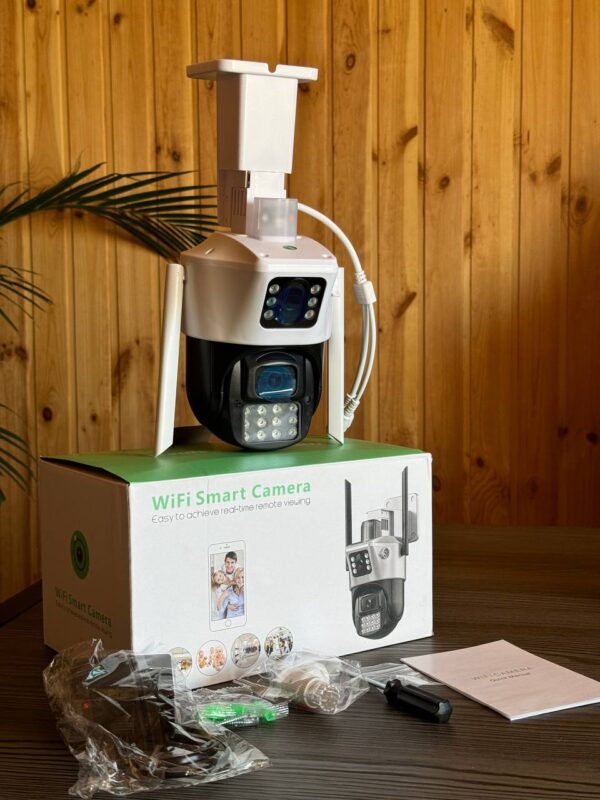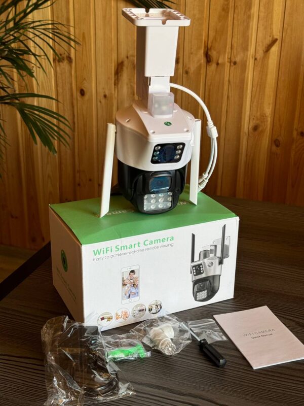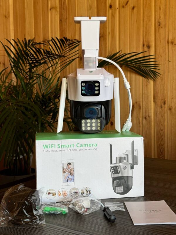 Встановлюється та налаштовується за лічені хвилини та замінює дві-три звичайних стаціонарних спрямованих камери спостереження. Кут по горизонталі 355 °, по вертикалі 90 °. На смартфон качаємо програму. Пару хвилин на налаштування, і Ви отримуєте зображення з камери на свій смартфон. Причому зображення із двох камер одночасно.