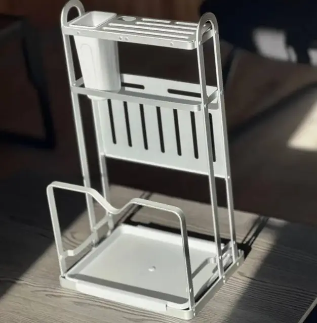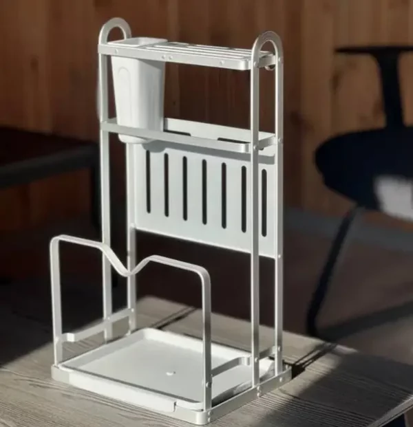 Вона допомагає підтримувати лад на робочій поверхні, забезпечуючи легкий доступ до всього необхідного приладдя. Стильне поєднання металу та пластику робить підставку практичним і естетичним доповненням кухні.