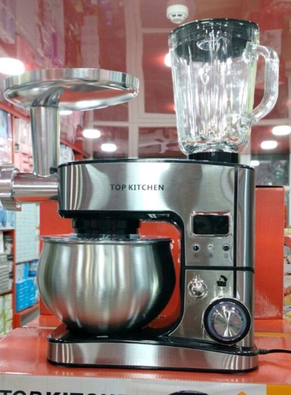 Вбити яєчний білок або вершки, приготувати картопляне пюре, соус, крем, мус, замісити рідке тісто для млинців та круте для пельменів та пирогів. Також він може перемолоти м’ясо на фарш, змішати крижаний коктейль або смузі, нашаткувати овочі та фрукти та вичавити сік із цитрусових. У комплекті є блендер, м’ясорубка та комбайн, який може працювати як подрібнювач, що перетворює цю модель на універсальну кухонну машину «3 в 1». Міксер може працювати у повністю автоматичному режимі. Вам достатньо лише покласти інгредієнти, надіти насадку та включити прилад. Можна встановити таймер роботи приладу від 30 секунд до 30 хвилин. При включенні міксера швидкість обертання збільшується поступово, щоб запобігти розбризкуванню інгредієнтів. Прилад має 6 швидкостей та імпульсний режим. Міксер оснащений чашею місткістю 7 літрів. Форма насадок та чаші підібрані так, що за будь-якої кількості продуктів насадка не залишає їх по краях неперемішаними. Чаша виготовлена з нержавіючої сталі, вона міцна і можна змішувати навіть гарячі інгредієнти. У комплекті йдуть насадки для збивання, перемішування та приготування пюре, гак для замішування крутого тіста. Блендер оснащений місткою скляною чашею ємністю 1,5 л з мірною шкалою. У кришці чаші є спеціальний отвір, що закривається мірним ковпачком для додавання інгредієнтів безпосередньо під час роботи. Стаціонарний блендер дуже зручний у використанні. Він унеможливлює бризки при роботі, тому що закритий кришкою. Його не доведеться тримати в руках, на відміну від занурювального блендера. М’ясорубка дозволяє рубати м’ясо з продуктивністю 0,9 кг/хв. У комплекті три ґрати з різним діаметром отворів для приготування фаршу. Комбайн є універсальним багатофункціональним пристроєм. Міксер оснащений системою безпеки..