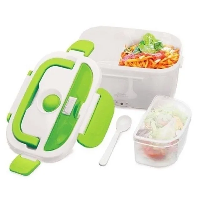 Це оригінальний харчовий контейнер, оснащений нагрівальним елементом. Компактні габарити дозволяють брати контейнер з собою на роботу, природу, дачу, пікнік, в поїздку, розміщуючи виріб в невеликій сумці. Герметичний бокс з чотирма застібками виключить можливість протікання харчових продуктів. У комплект поставки входить все необхідне для щоденної експлуатації: ємність, кабель і навіть ложка! Ланч-бокс з підігрівом має компактні розміри і навіть в заповненому стані не буде важити більше 2 кг у кришці ланч-боксу є відділення, де лежить ложка, туди ж можна покласти і інші приналежності для їжі; підключивши ланч-бокс до 220-ти вольтової розетки ви зможете швидко підігріти остигнула їжу за 5-20 хвилин;