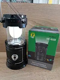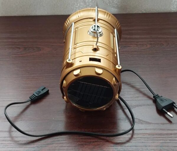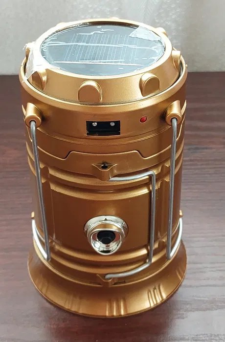Led лампа розташована на нижній частині ліхтаря. Ліхтар має вбудований акумулятор, який можна зарядити від кабелю мережі (у комплекті) або від сонячної батареї (вбудована в кришку ліхтаря).