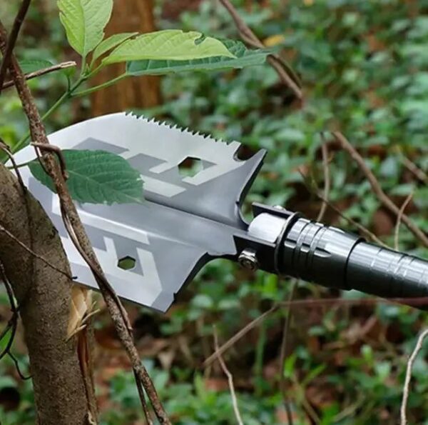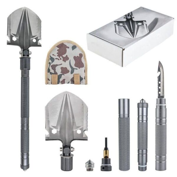 Полотно лопати виготовлене із стійкої до корозії інструментальної сталі із підвищеним вмістом вуглецю. Відмінно поводиться навіть на кам’янистому грунті. Живець складовий, виготовлений з авіаційного алюмінію з анодованою поверхнею. Усередині складеного черешка знаходиться ніж, стропоріз, відкривання, пилка, потужний склобій, магнієве кресало. Додатково, можна використовувати ніж на живці як острогу та ножа для оброблення риби. Варіанти застосування багатофункціональної складаної лопати: мотика; лопата; пила; стропоріз; ніж (острогу); склобій; гайкові ключі; топірець; кресало; відкривання для консерв та пляшок.