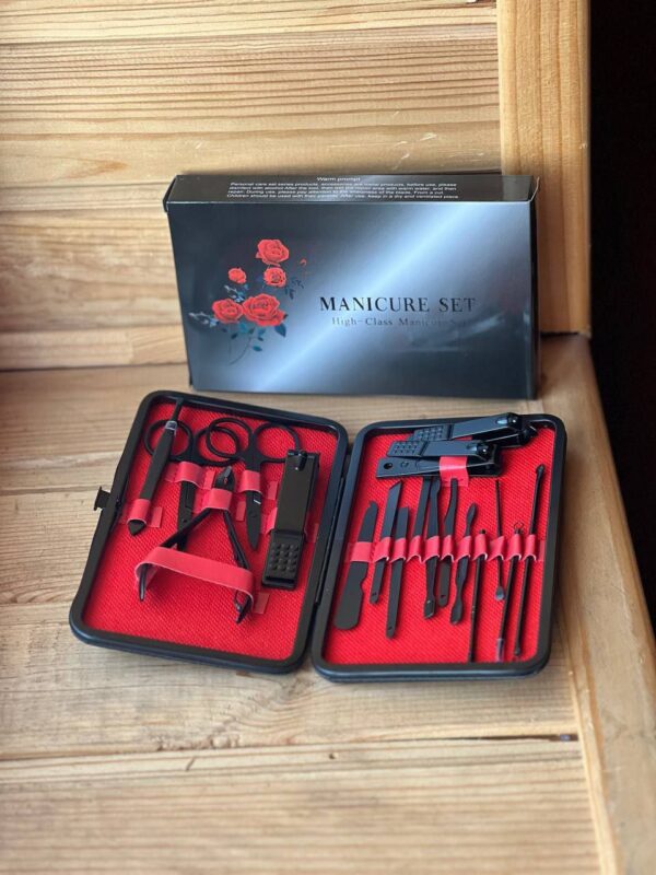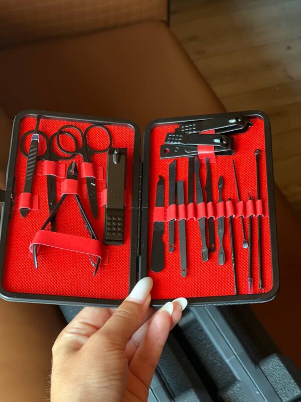 Манікюрний педикюрний набір складається із 18 предметів, виготовлених із міцної медичної сталі. У ньому є необхідні інструменти для очищення, підрізування та підпилювання нігтів, надання їм потрібної форми та красивого блиску, турботи про доглянутий зовнішній вигляд кутикули та навколонігтьового валика. Цей набір ідеально підходить для збереження нігтів у відмінному стані.