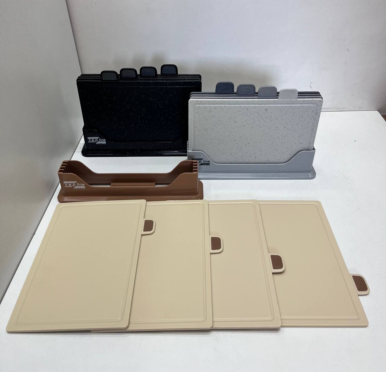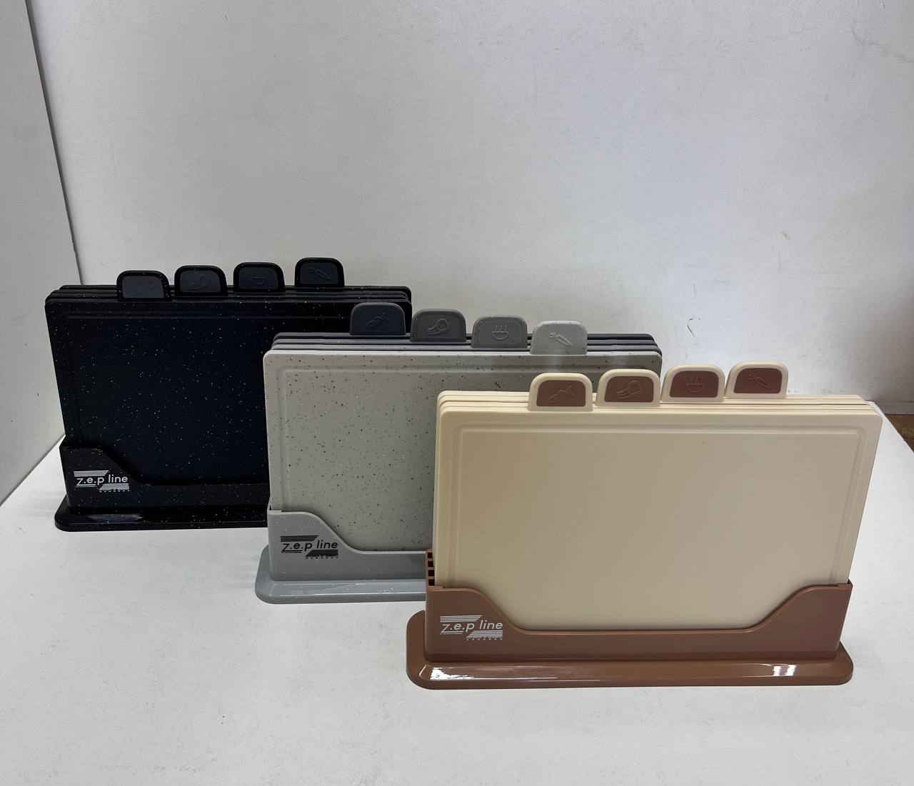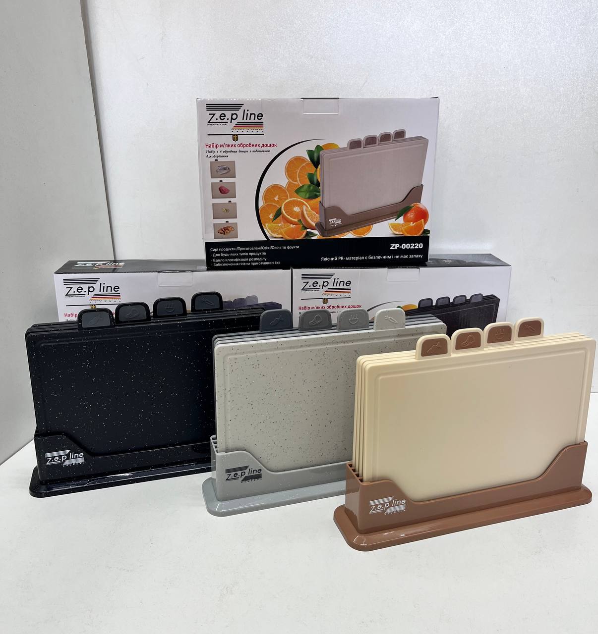 В набір входить: – доска для овочів та фруктів – доска для різного виду мʼяса 2 шт – доска для риби – підставка