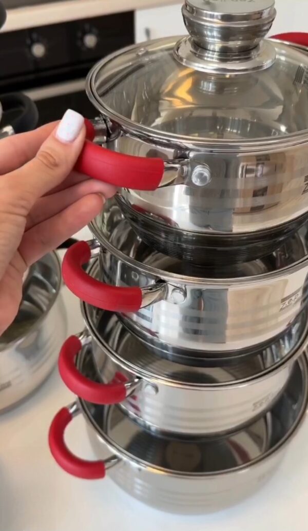 Усі предмети набору каструль мають 9-шарове капсульне дно, зроблені з нержавіючої харчової сталі 18/10 високої якості. Досить швидко прогрівається й тривалий час тримає високу температуру, не окиснюється. Ручки кріпляться надійними заклепками, що славляться своєю довговічністю.