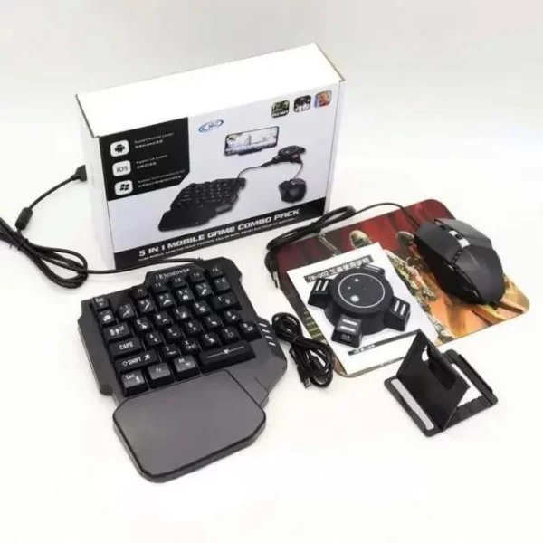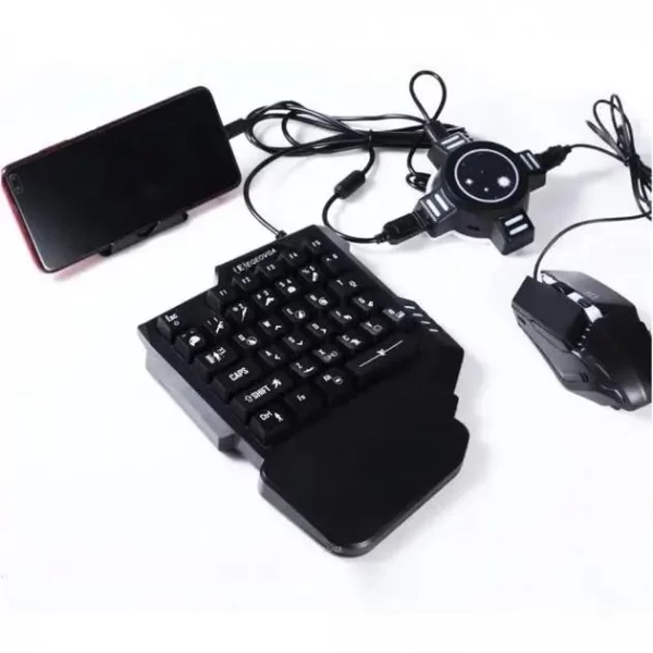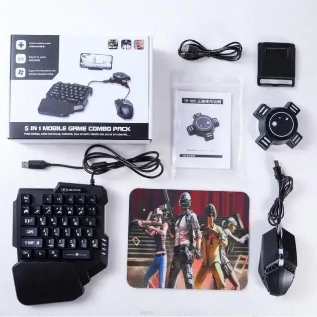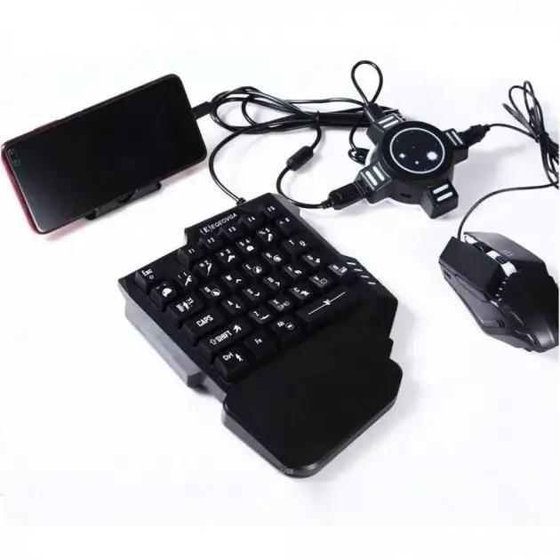 Набір клавіатури та миші з трьох частин NEW — клавіатура обладнана світлодіодною RGB статичною підсвіткою. М’який хід клавіш, корпус з ABS-пластику з soft-touch покриттям подарує комфорт і зручність. Миша дротова, з динамічною підсвіткою. Максимальна оптична здатність — 6400 DPI. В адаптері є 2 роз’єми USB, для під’єднання клавіатури та миші, а також стандартний роз’єм 3.5 мм для навушників. Зі зворотного боку розташовані Type-C порти для під’єднання адаптера до консолей.