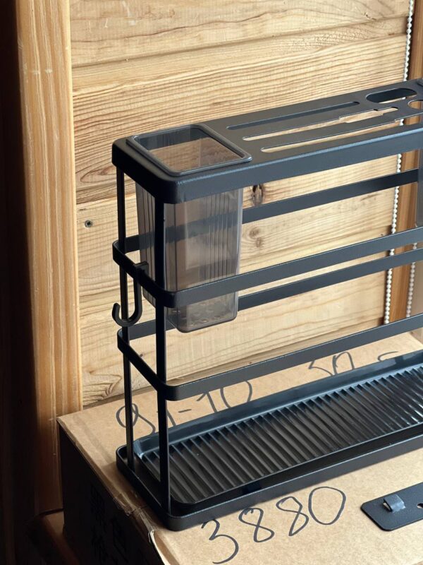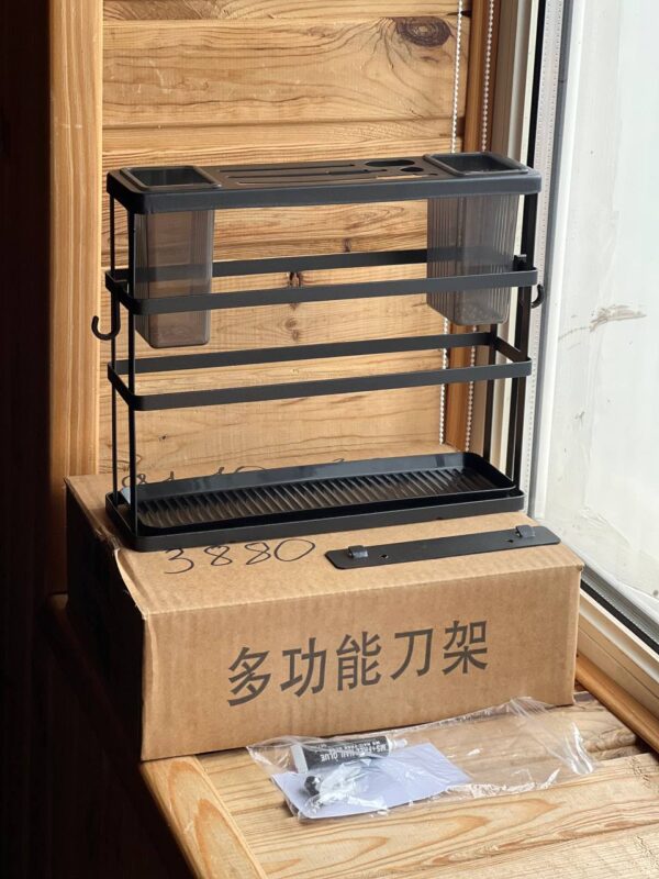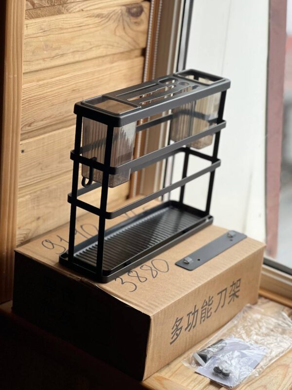 Товар є багатофункціональною настінною підставкою з металу для зберігання кухонного приладдя. Підставка має компактні розміри, що робить її зручною для розміщення на кухонній стільниці.