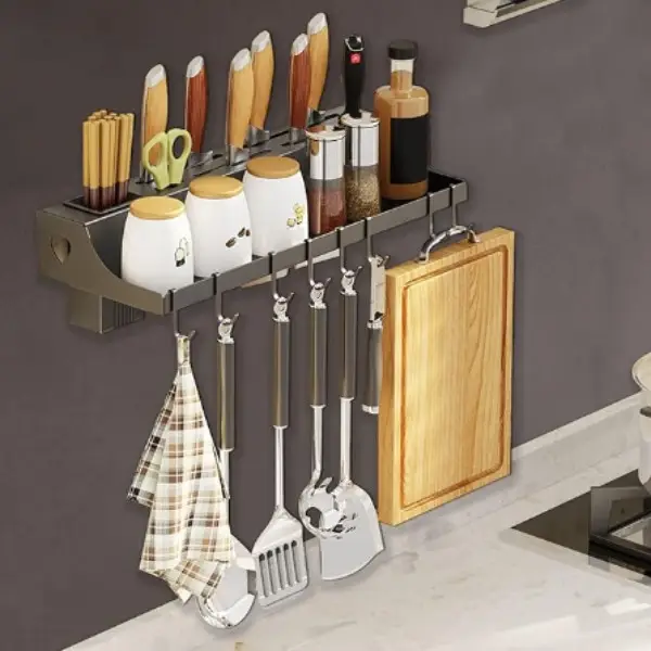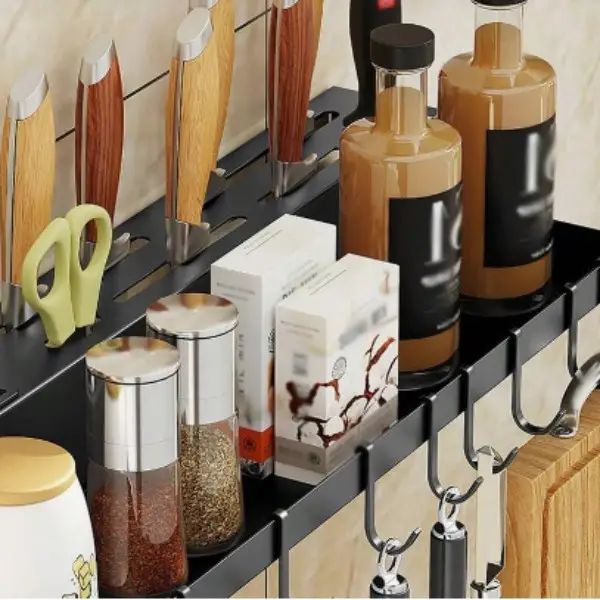 Підвісна полиця для спецій із високоякісного та міцного матеріалу: органайзер для спецій виготовлений із неіржавкої сталі. Кожна настінна полиця обладнана 8 знімними гачками. Він покритий лаком для запікання й добре поєднується з більшістю кухонь або прикрас. Вони стійкі до корозії, водонепроникні та легко чистяться. Тому вони особливо міцні і, на відміну від полиць із пластику, набагато довговічніші.