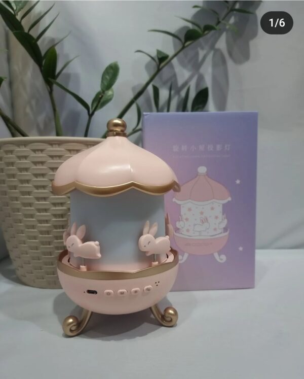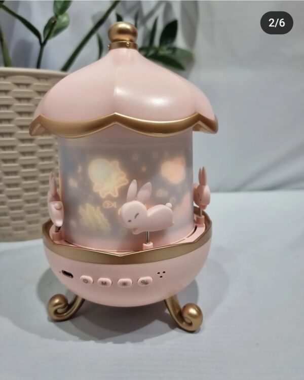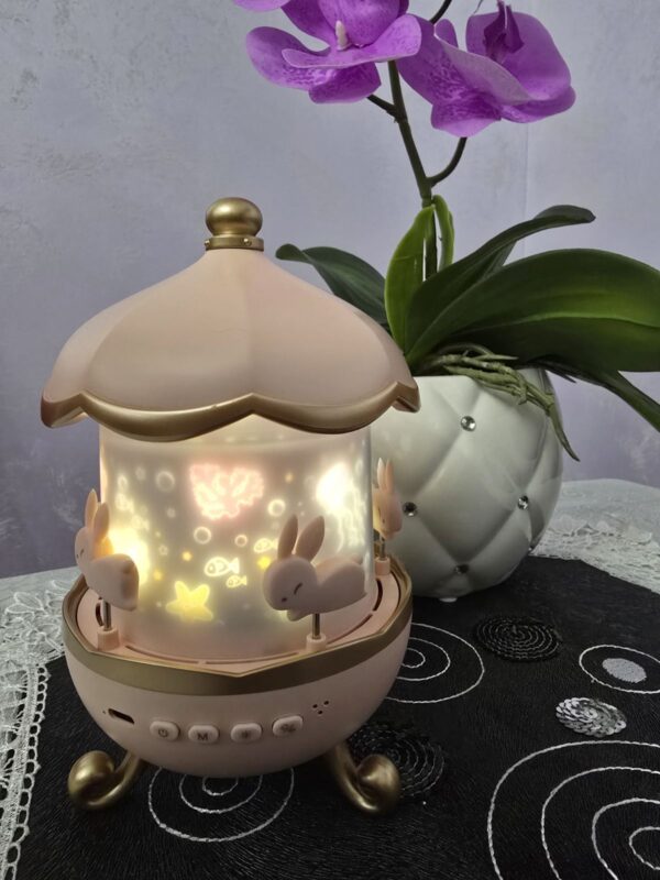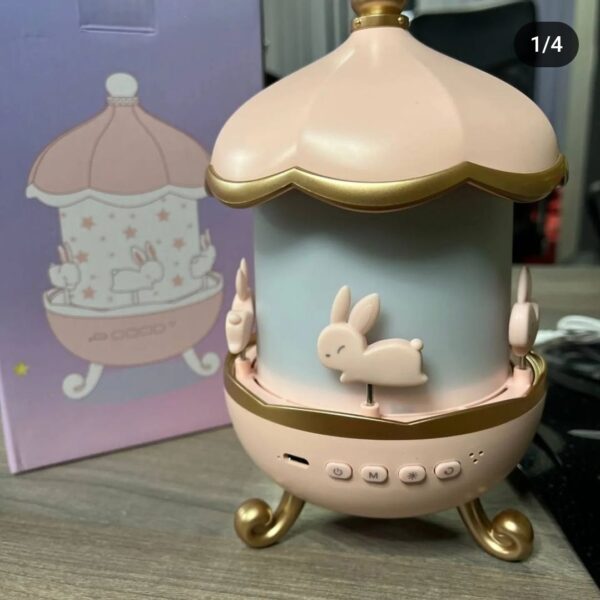 Дитячий музичний нічник Музичний нічник-проєктор з Bluetooth “Карусель” — це стильний та функціональний аксесуар для дитячої кімнати. Він обладнаний акумулятором 1800 мА·год і пропонує 12 змінних картинок для проєкції, включно з 6 стандартними та 6 додатковими. Вбудована Bluetooth-колонка дає змогу відтворювати улюблену музику або казки, забезпечуючи якісний звук. У разі закритого ковпака пристрій працює як нічник із м’яким світлом, а під час зняття ковпака — як проєктор, проєктуючи зображення на стіни та стелю. Також доступна функція обертання для більш живого та заворожливого ефекту. Переваги: Підтримка Bluetooth для прослуховування музики й аудіоказок Акумулятор на 1800 мА·год для тривалої роботи без під’єднання до мережі Можливість використання як нічника та як проєктора з картинками Функція обертання проєкцій і іграшкових зайців на 360° 3 режими підсвітки: білий, жовтий і синій із можливістю комбінування кольорів 12 змінних картинок для проєкці. Регульована яскравість і колір нічника Прекрасний вибір для дітей від 0 до 10 років Характеристики: Розміри: 120 х 190 мм Матеріал: ABS пластик Потужність: 5 Вт Вхід: 5В / 0.3А Акумулятор: 1800 мА·год Зарядний порт: USB Type-C Тип вимикача: пульт Тип лампи: світлодіодна (LED) Кількість світлодіодів: 3 шт. Висота: 19 см Ширина: 12 см