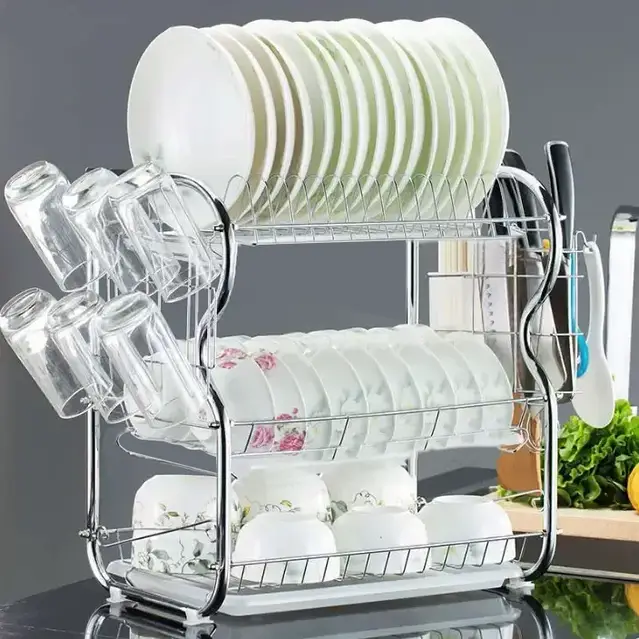 Тройная сушилка для посуды настольная из нержавеющей стали / Сушка-органайзер для посуды, приборов, чашек