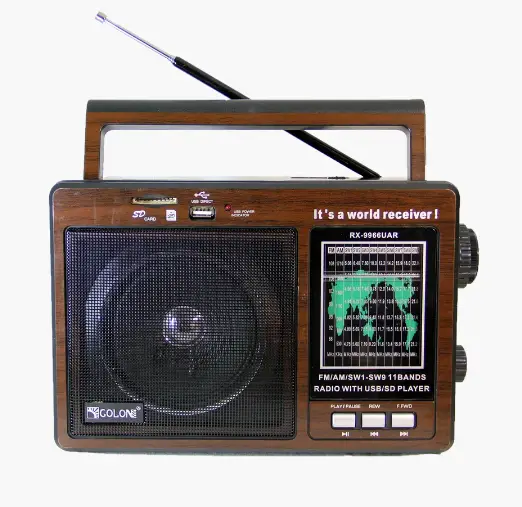 Радіоприймач Golon RX-9966UAR – портативна акустика із вбудованим акумулятором. Має MicroSD кардрідер, що дозволяє прослуховувати аудіофайли на MicroSD картах, USB слот, дозволяє прослуховувати аудіофайли з флешок та дискових накопичувачів, аудіо вхід (AUX), роз’єм для навушників 3.5mm.
