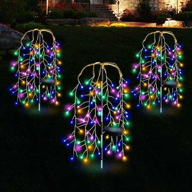 Садовий світильник Верба SFK-46 автономний LED-декор для саду та ділянки Комплект садового декору на сонячній панелі Верба SFK-46 Садовий світильник «Верба» SFK-46 — це елегантне та чарівне освітлення, яке перетворює ваш двір, сад або патіо на казковий простір. Дизайн світильника нагадує гнучкі гілочки верби, ніжно мерехтливі у темряві, створюючи атмосферу затишку та спокою Світильник працює повністю автономно, використовуючи сонячну енергію, і не потребує підключення до електромережі. Вдень вбудована сонячна панель заряджає акумулятор, а вночі світильник автоматично вмикається, наповнюючи сад м’яким та різнокольоровим світлом (7 плавно змінюваних кольорів) Гнучкі гілки з LED-лампочками дозволяють формувати унікальні композиції, створюючи оригінальні світлові фігури за вашим бажанням. Модель SFK-46 ідеально підходить як для декоративного освітлення, так і для створення святкової атмосфери