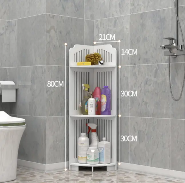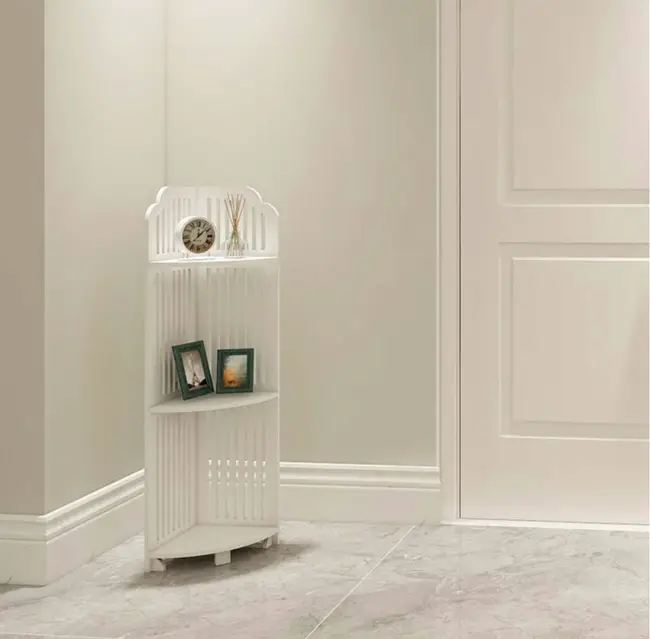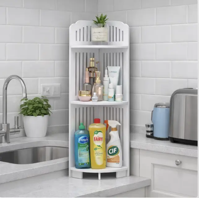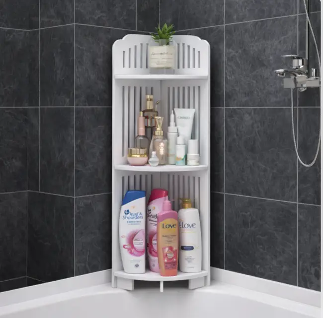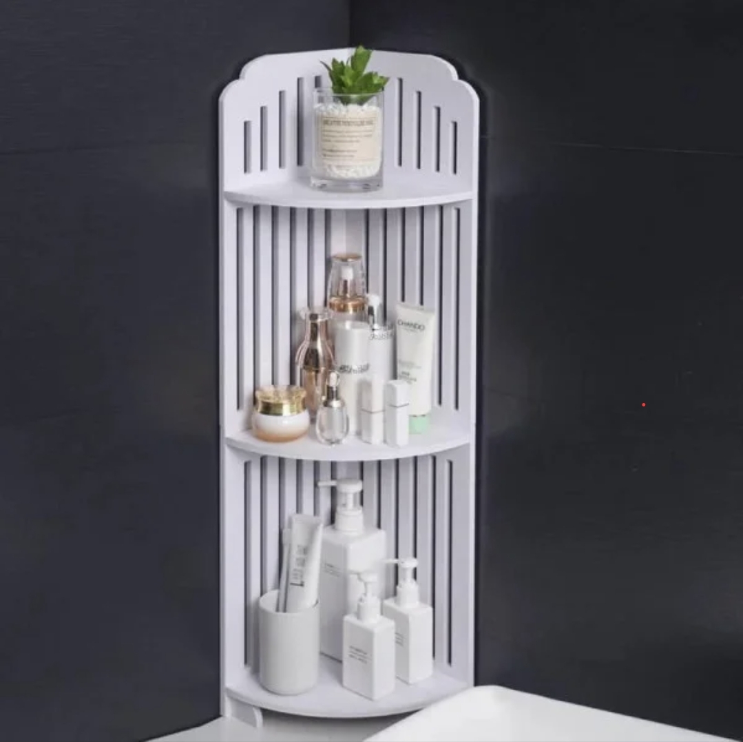 Завдяки кутовою формою етажерка займає мінімум місця і водночас вміщує максимум засобів.