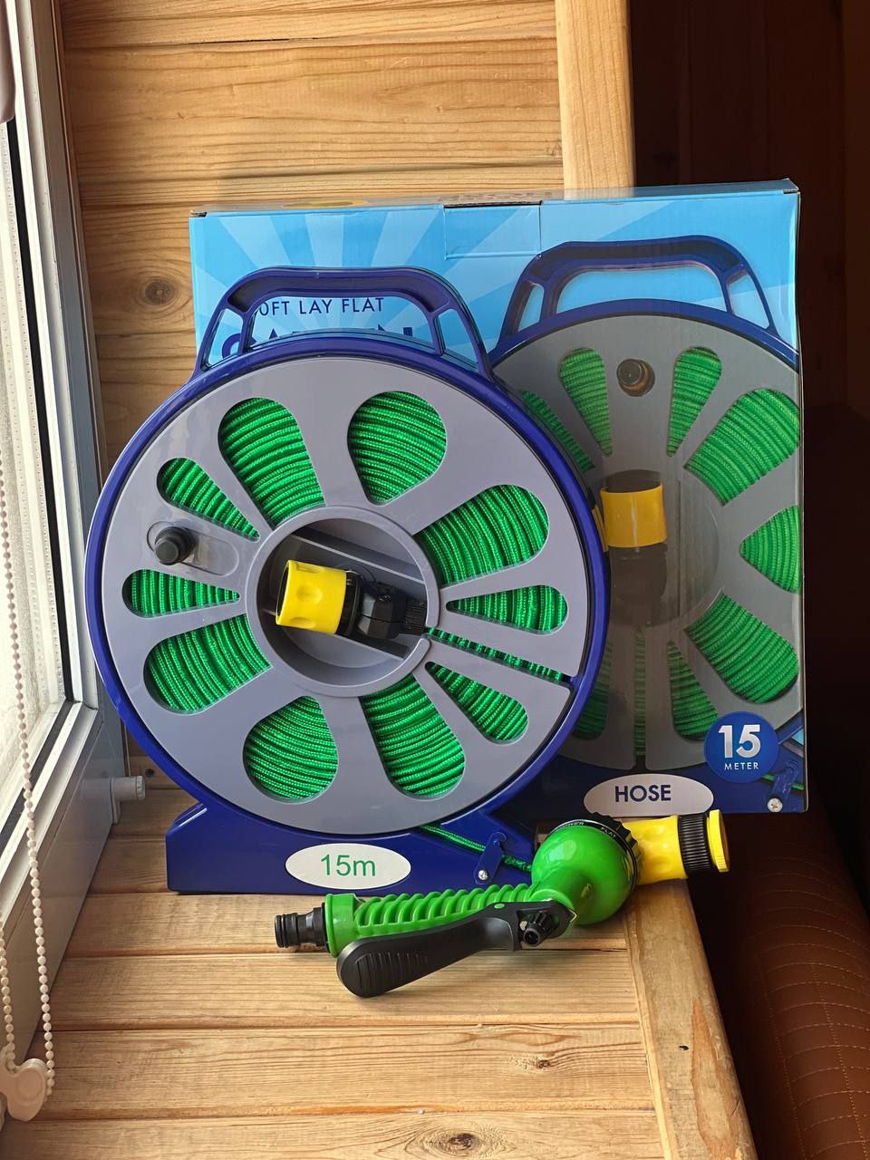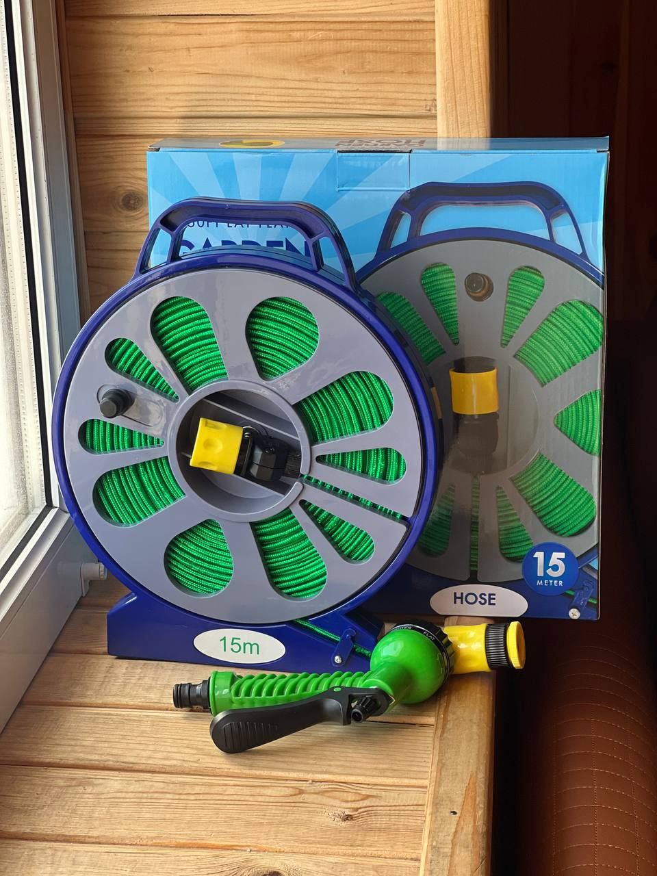 Садовий шланг Garden Hose 15 м із розпилювачем та котушкою — ідеальне рішення для поливу саду, миття авто, тераси або прибудинкової території. Універсальний комплект дозволяє легко та ефективно виконувати будь-які роботи з водою.