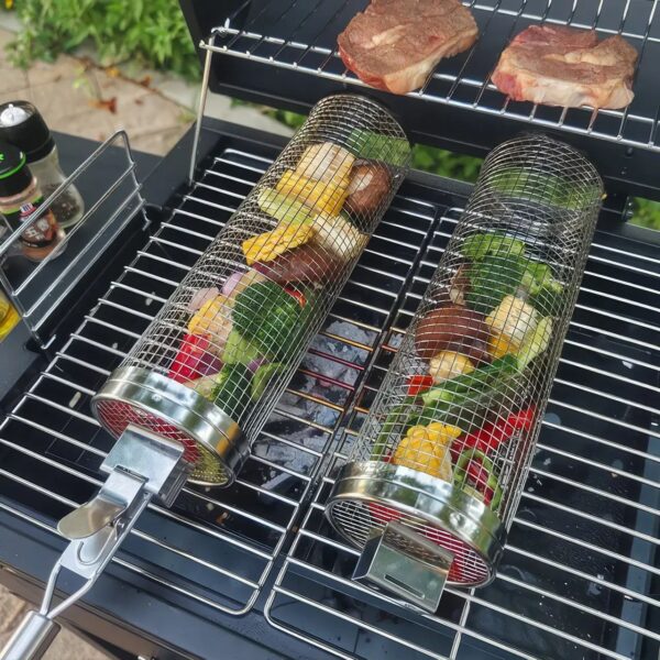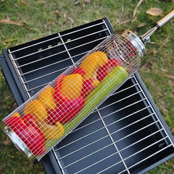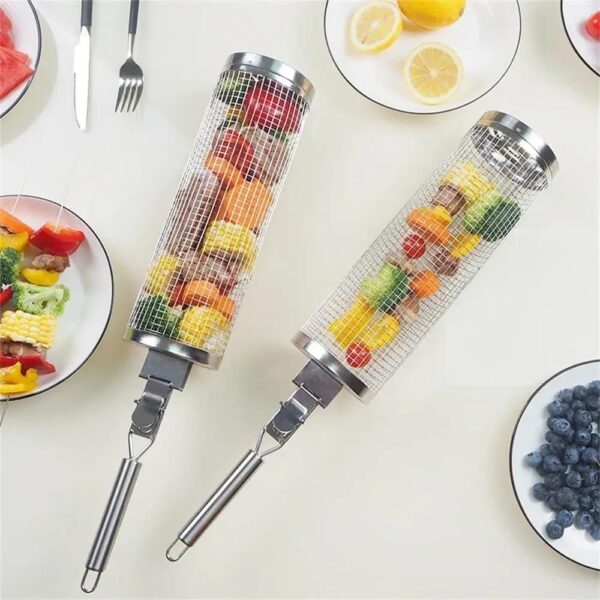 Продукти залишаються на місці, забезпечуючи ідеальне приготування кожного шматочка. Крім того, грати для гриля мають циліндричну форму, що дозволяє легко перевертати її на грилі за допомогою спеціальної ручки, яка йде в наборі. Завдяки круглій формі решітки для барбекю Ви зможете чудово контролювати процес смаження та досягти бажаного ступеня золотистості та підсмаженості шашлику та грилю.