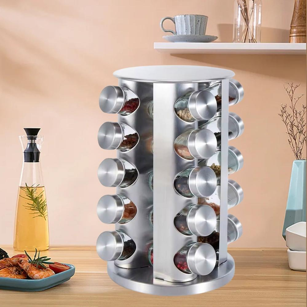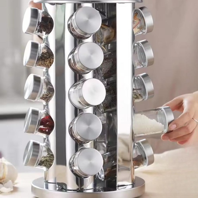 Кожна господиня на кухні має різні спеції, приправи та прянощі. У когось їх зовсім небагато, тільки основні, а в когось величезна різноманітність. Зазвичай, ця різноманітність зберігається у всіляких баночках і коробочках, які рідко коли гармоніюють між собою та вписуються в загальний стиль кухні. А ще під час приготування їжі часто буває складно знайти потрібну спецію. Приходить діставати купу баночок, поки дістанешся до бажаної, потім усе це щастя ховати назад. Спецівниця Spice Carousel, до якої входить 16 місткостей, допоможе вам знайти зручне місце для різних спецій, солі та цукру. Для виробу характерний гарний, сучасний дизайн, завдяки якому він впишеться в інтер’єр будь-якої, навіть дуже вишуканої кухні. Підставка для спецій виготовлена з неіржавкої сталі та може обертатися по колу, що дуже зручно та практично. Ємності виготовлені зі скла, а кришки до них — з неіржавкої сталі. Баночки щільно та надійно закриваються, завдяки чому ароматні приправи не втратять своїх властивостей і запаху. Ємності мають зручну круглу форму. Набір легко миється після використання. Підставка для спецій  дасть змогу вам зберігати спеції упродовж тривалого часу без втрати їхніх корисних і смакових якостей. Вона стане чудовим подарунком для друзів або родичів.