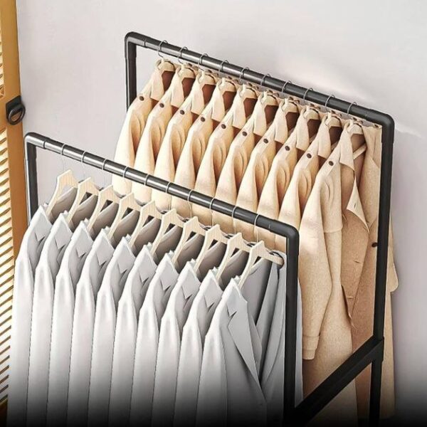 Вішалка спроектована для організації простору в невеликих квартирах, гардеробних або навіть в невеликих магазинах одягу.