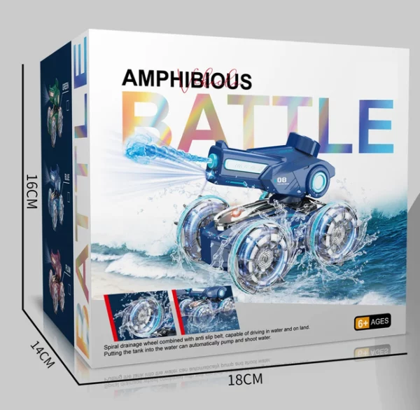 Пориньте у світ неймовірних пригод з радіокерованим танком-амфібією, оснащеним водяною гарматою! Ця бездротова іграшка стане ідеальним подарунком для дітей та дорослих, які обожнюють динамічні ігри на суші та у воді. Завдяки потужному пульту дистанційного керування ви зможете не лише направляти рухи машинки, а й активувати яскраве LED-підсвічування та керувати водяною гарматою. Водяна гармата має автоматичну систему заповнення і стріляє на відстань до 4 метрів, створюючи захопливі водні баталії.