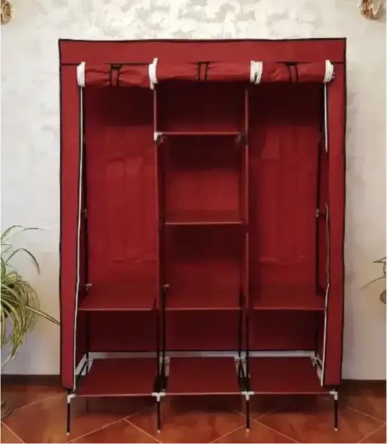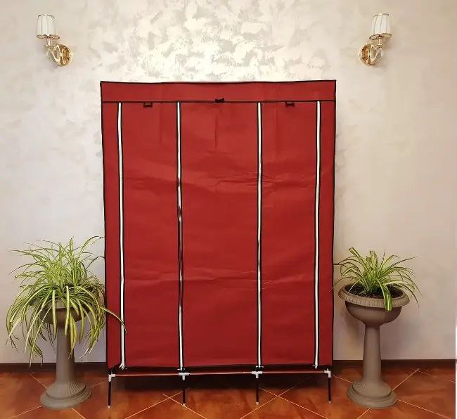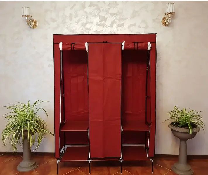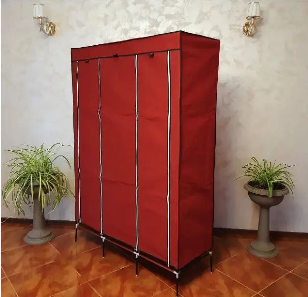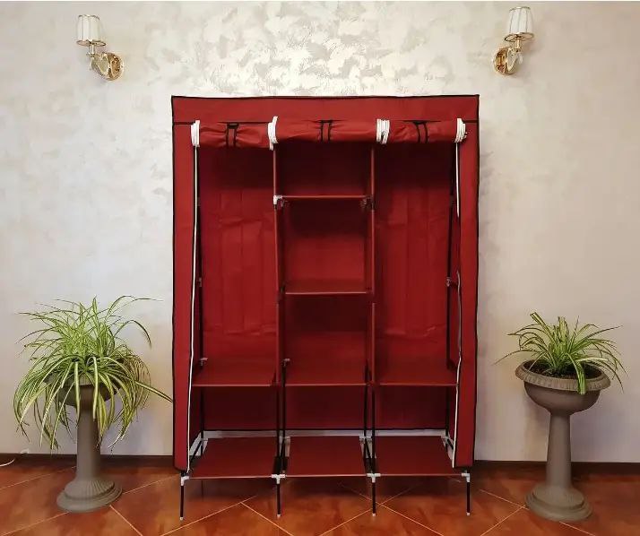 Велика тканинна шафа на 3 секції — це стійка збірна металева конструкція, на яку по всьому периметру натягується тканинний чохол. Ця тканинна шафа є чудовим варіантом розв’язання проблеми розміщення речей в житловирах, що орендуються, гуртожитках, на дачах, тому що така збірна шафа легко транспортувати з місця на місце.