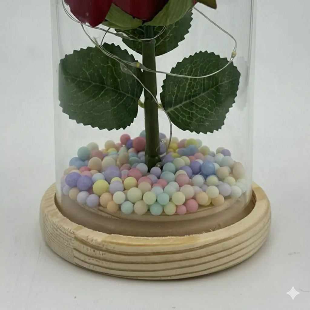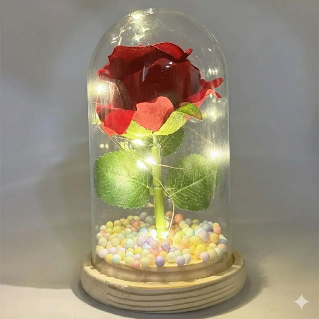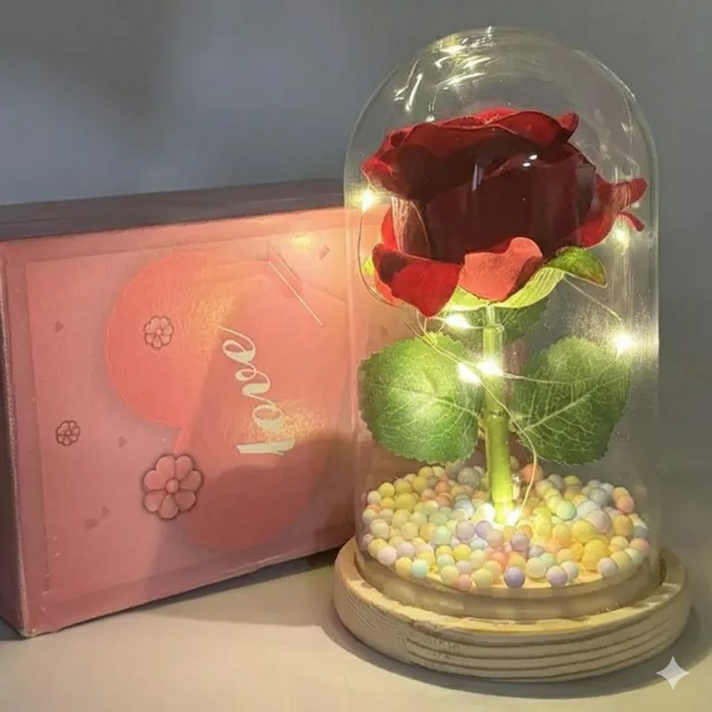 Занурте вашу улюблену в атмосферу романтики за допомогою цієї дивовижної Міні троянди в колбі з підсвічуванням, представленою в елегантній подарунковій коробці.  Кожна витончена червона троянда всередині скляної колби створює чарівне враження, освітлюючи кімнату своїм теплим свіченням, що робить її ідеальним символом вашої любові та відданості.