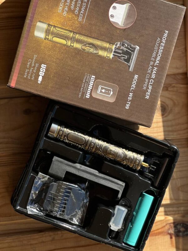 Тример Professional hair clipper для окантовки, малюнків і бороди, акумуляторний. Ріжучий блок виготовлений з твердої вуглецевої сталі з хромованою фінішною обробкою для стійкості до корозії. Гостро заточені леза легко створюють точний зріз довжиною 1/10 мм. Ніж T-Blade застосовують для оформлення контурів стрижки: лінія окантовки в шийно-комірній зоні і за вухами, гоління бороди, вусів, баків або підчистки після машини. Тримерами з Т-ножами виконують візерунки на волоссі у стилі Hair Tattoo – стрижки татуювання. Li-Ion-акумулятор без ефекту хімічної пам’яті працює до 90 хв безперервно. Літієва акумуляторна батарея не втрачає ємність, якщо триммер ставить на зарядку, не чекаючи повної розрядки, не вимагає тренувальних циклів «розряд-заряд». Збалансований корпус Hair Clipper зручно лягає у руку. Працюючий без вібрації зі швидкістю 6000 оборотів за хвилину мотор передає на ніж зусилля для стрижки будь-якого волосся незалежно від структури або густоти. Поєднання швидкості та потужності допомагає отримати точний окантувальний зріз.