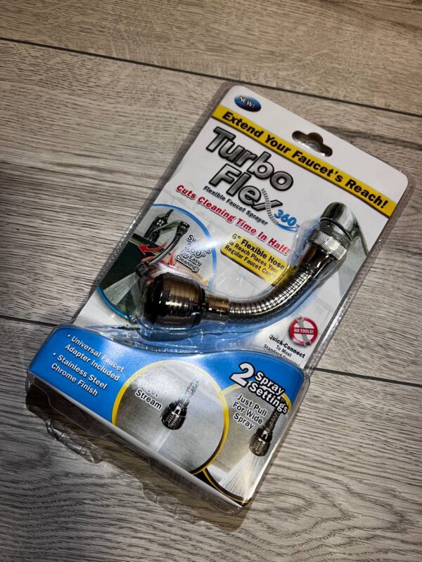 Шланг Turbo Flex 360° виконаний з якісної нержавіючої сталі, але при цьому він відрізняється гнучкістю та маневреністю. Діаметр шланга становить 6 дюймів, і він може розвернутися на 360 градусів. Крім того, в даному аераторі передбачено функцію регулювання режимів обприскування, які перемикаються завдяки прокручування головки шланга.