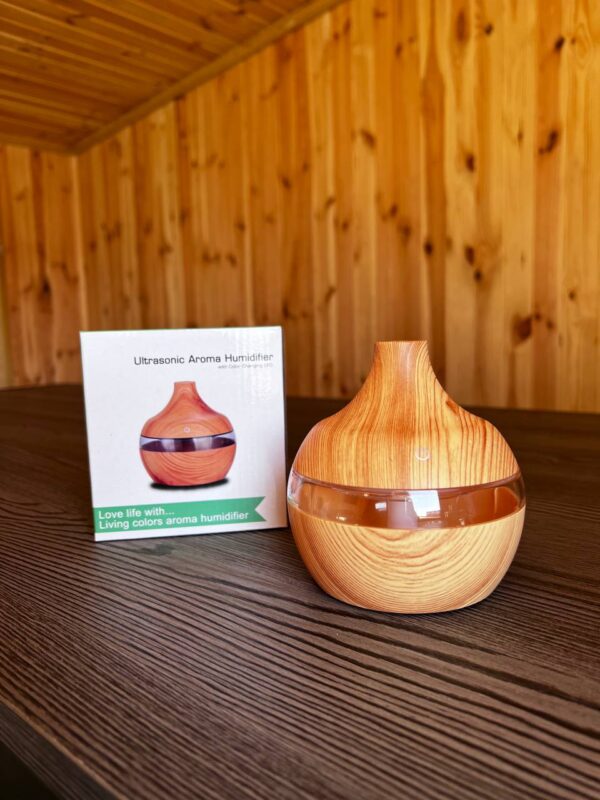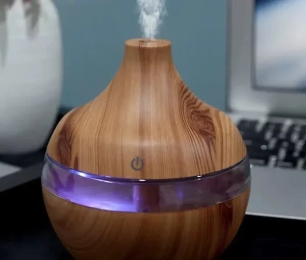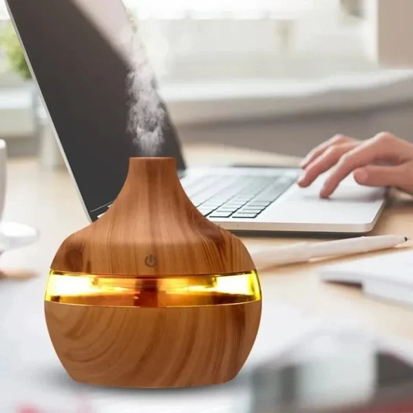 Зволожувач повітря з текстурою дерева та 7 кольоровими лампочками, одночасно виконує функцію ароматерапевтичного дифузора, дозволяючи вам насолоджуватися перевагами ароматерапії під час зволоження вашого будинку.