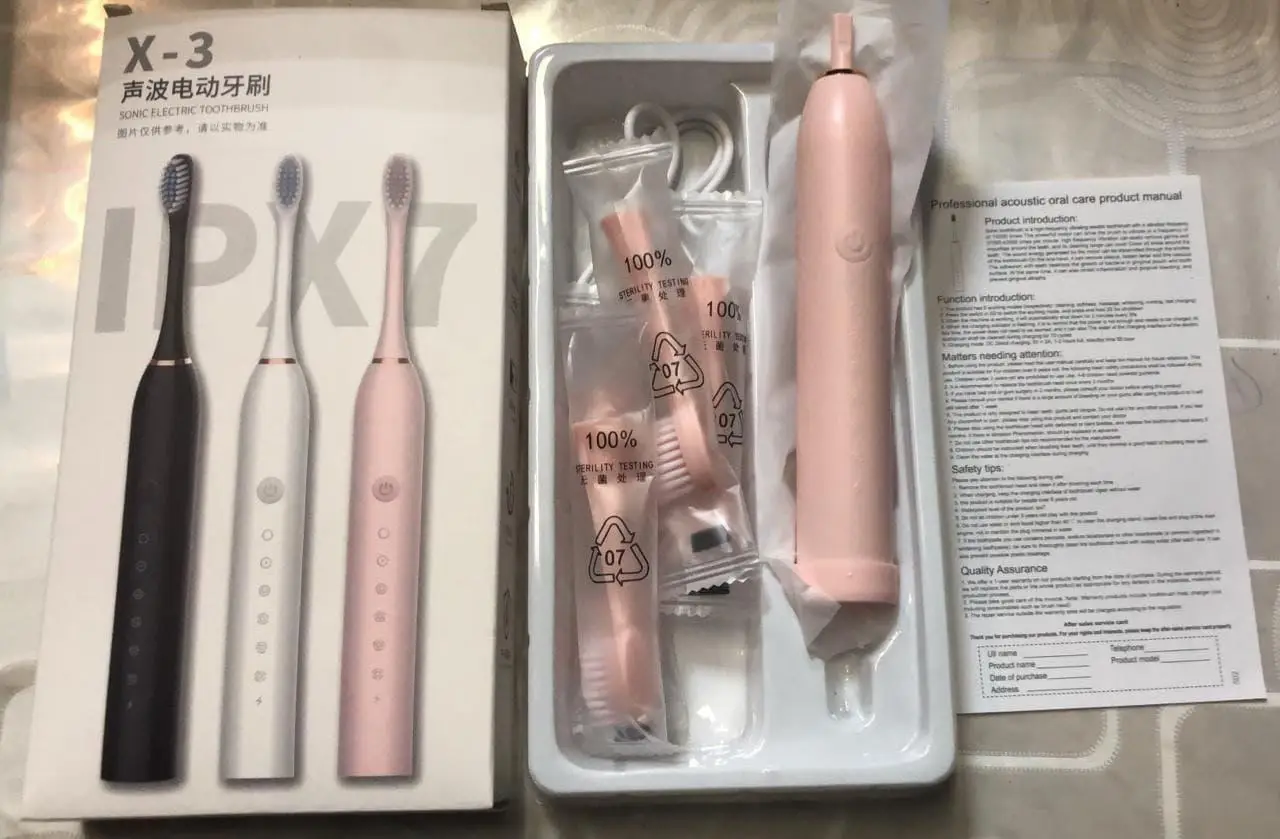 8. Матеріал ручки: пластик Сучасний дизайн та зручна ручка роблять зубну щітку Sonic Toothbrush X-3 ще більш привабливою. Низький рівень шуму дозволяє використовувати пристрій навіть уночі, не турбуючи інших членів сім’ї. Довжина кабелю становить 1 метр, що забезпечує свободу рухів під час чищення зубів. Тривалість гарантії становить 2 роки, що свідчить про надійність та якість продукту. Насамкінець, зубна щітка Sonic Toothbrush X-3 – це ідеальний вибір для тих, хто шукає ефективний і зручний спосіб очистити свої зуби. Своїми унікальними характеристиками та перевагами цей продукт від компанії LY-604 стане незамінним інструментом у вашому раціоні гігієни зубів.